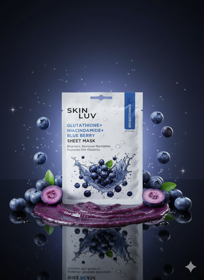 The SkinLuv Blueberry + Glutathione + Niacinamide Sheet Mask helps brighten, refresh, and revive dull skin. Blueberry extract provides antioxidant protection, Glutathione helps fade dark spots and blemishes, and Niacinamide improves elasticity and smoothness. The soft, lightweight sheet allows better serum absorption, leaving your skin clearer, even-toned, and naturally radiant after each use.